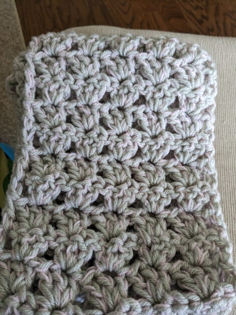 Several ladies started making a simple shell scarf at our last workday so I started one today with the new yarn.