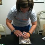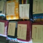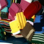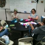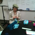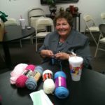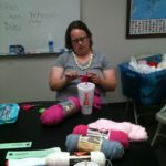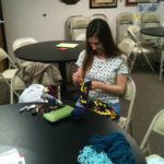 One lady came to package the scarves. She doesn’t knit or crochet, but she wanted to help. Having her there to package the scarves meant that others could keep going on their projects in progress. She spent about an hour getting just about 30 scarves packaged for delivery. We were so glad to have her join us.