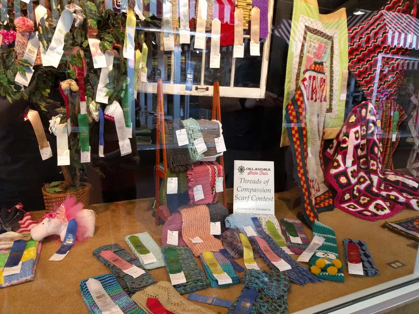 It was so neat to see all these scarves on display at the Oklahoma State Fair! We hope that each donor knows how much we appreciate their gift. We’ll be admiring them, photographing them, and packaging them at our next work day, Sunday 10/1. Join us if you can!