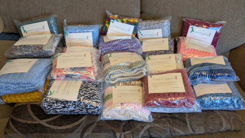 I hope you’ll continue to join us in this good work. All are welcome to join us at our work days each month, or to make scarves on your own and get them to us for packaging!